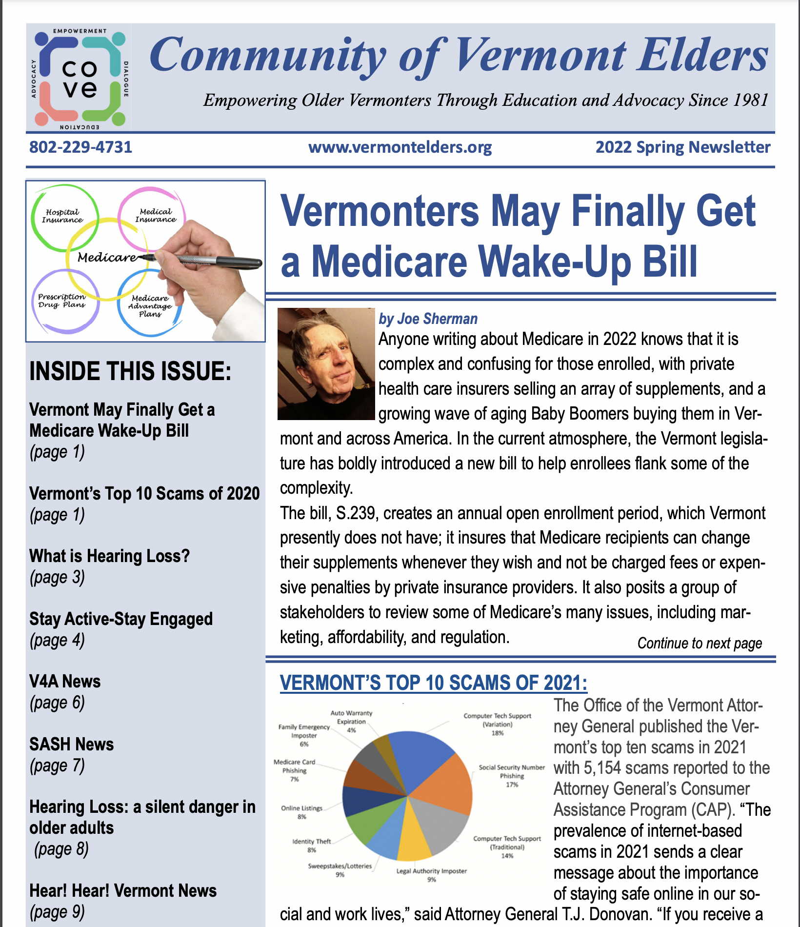 Click on the COVE-VT SMP quarterly newsletters below for information about timely issues affecting older Vermonters, including important guidance for Medicare recipients. If you know of events or issues that might be worth highlighting on the newsletter, please let us know at [email protected].